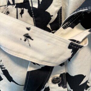 Elevate your outerwear with this chic Black Rivet trench coat featuring a bold black and ivory abstract floral print. Designed with a belted waist for a flattering silhouette, button front closure, and functional pockets. The back vent detail and adjustable sleeve straps add a touch of classic trench styling.