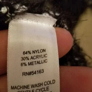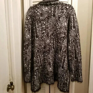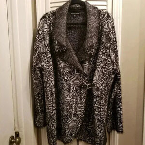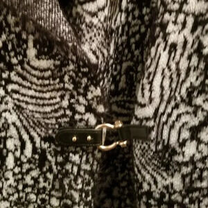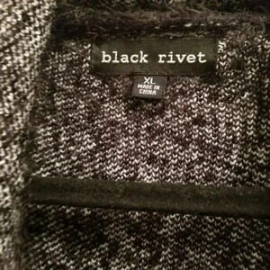 Beautiful Black Rivet black and white sweater with horseshoe buckle. The fabric is very soft with black fringe on the sleeves and hem. Substantial weight. Size XL. Pit to pit with sweater closed 24" and length 33". 68% Nylon, 30% Acrylic, 6% Metallic. Excellent condition.
