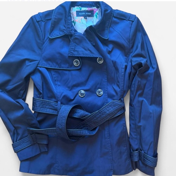 Black Rivet tailored trench-style jacket in a rich cobalt blue. Features a double-breasted front, adjustable waist tie, and a standout floral interior lining that adds a pop of color.