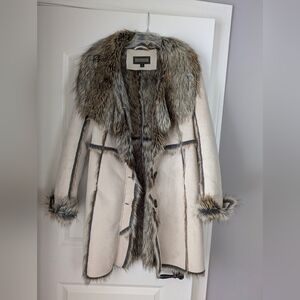 Black rivet cream suede winter coat featuring a faux fur trim and interior lining.