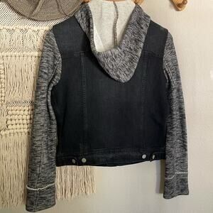 Black Rivet Women's Button Closure Hooded Denim Jacket in Distressed Black size medium. Excellent condition. Like new condition. Distressed Denim. 2 Button Closure Chest Pockets. Two side Welt pockets. 5 Button Placket. Knitted Hood and Arms with Contrasting Color. Drawstring Hood. Removable Hood. Machine Washable. Sleeves are stretchy, denim is not.