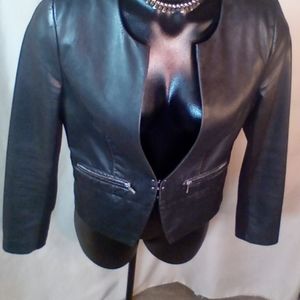 Faux Leather Jacket w/Silver Fastener & Zipper Design Pockets & Sweater Material Gives The Arms More Memory Stretch Perfect For Cool Evenings In Good Condition.