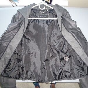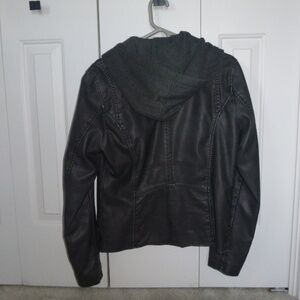 Pre-owned women's black leather jacket by Black Rivet. Hood zips out if desired. Non-smoking home. Soft, worn in feel. Reasonable offers considered.