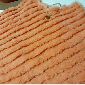 *This shawl by Black Rivet is super cute! It is made of orange dyed genuine rabbit fur. It is super soft, and comfortable. There are rows of fur on a knit backing. There is a pull in the fabric on the inside, and a hole on the side (see pics). It's not very noticeable, because of the fur covering. This shawl is the perfect pop of color for Winter. You can wear this with a light sweater, or turtleneck.*