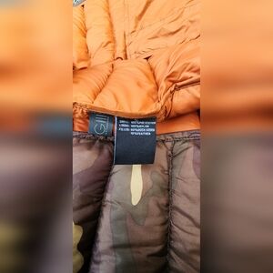 Warm 90% down puffer vest with a rich rust color. Features a cozy design and zip closure.