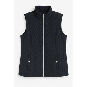 This stylish Black Rivet quilted vest in navy blue is perfect for layering through the seasons. It features a diamond quilted pattern, full zip front closure, and snap-button front pockets for a sleek yet functional look. Lightweight and comfortable, this versatile piece pairs beautifully with jeans, sweaters, or long-sleeve tops for effortless casual style. Pre-owned in excellent condition with minimal signs of wear. The signs of wear are on the inside of the collar, pictured.