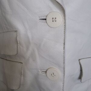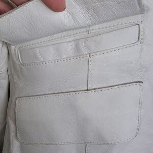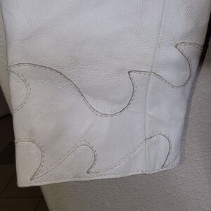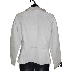 Excellent pre-owned condition. No flaws to note. Women's Black Rivet white leather moto jacket w/flames Size Medium.