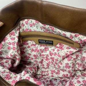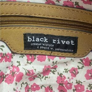 Black Rivet Handbag Tan W/Dual Handles. Excellent pre-owned condition. Top zipper closure. Braided accents on handles and across the front. Floral interior with one zipper pocket under flap Faux leather. Measures approximately 17" x 10" with 7.5" shoulder drop.