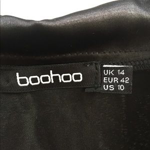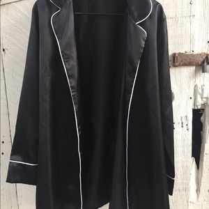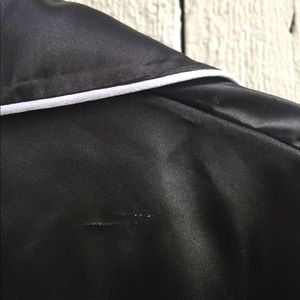 This black satin-feeling robe is 100% polyester with five buttons down the front. It has a lapel collar with white piping that runs down the front of the robe. From top to bottom it measures 24” and from pit-to-pit on the back is 22.” There’s a small snag mark on the upper right shoulder. Nice little black robe to wear over your sexy pjs.