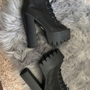 Black platform rocker inspired heels. In pictures it shows the quality worn 1 time. Minor white scuffs as pictured. Available immediately for shipping.