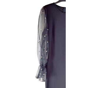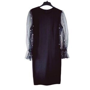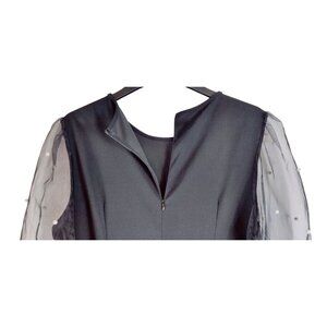 Classic black shift dress with sheer black puff sleeves and pearl accents. The shift is a polyester/spandex blend allowing for the best fit and comfort. Very elegant and ready for a special dinner or cocktail party. Excellent condition; no snags, stains or missing pearls.