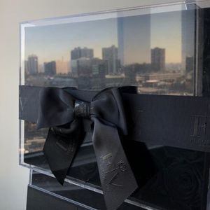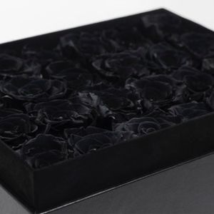 2 dozen (24) black roses, embedded in a vegan leather box with clear acrylic top. Fleur De Vie Logo debossed on the side of your keepsake reusable box. Grosgrain logo ribbon ties each box for an elevated chic look. Each flower is removable from the box and comes on our signature FDV metal stem.