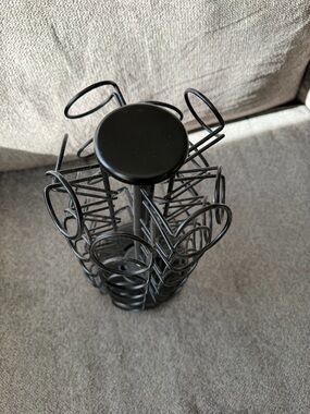 Rotating metal k cup rack. Holds multiple k cups. Sturdy black finish. Easy countertop storage.