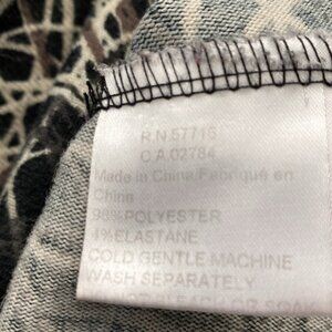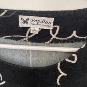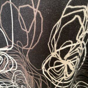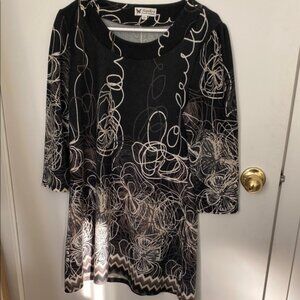 This tunic-style top features a round neckline, black color scheme, and three-quarter length sleeves. The shirt has a relaxed style with intricate white designs creating abstract floral patterns.