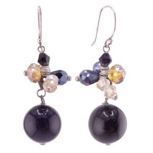 Black Round Stone with Dangles Sterling Silver Hook Earrings 1 3/4" NWOT