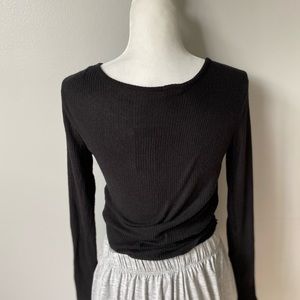 A black knit top with long sleeves with a gathered, tie front in black colored rib material. Brand new. Boutique.