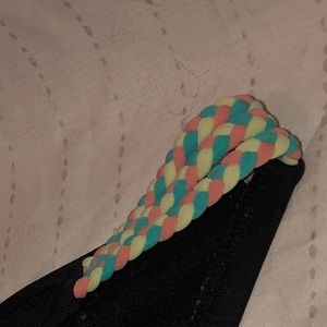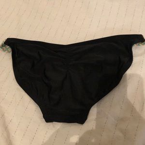 Bold colorful, braided side straps and ruched back make this bikini a sexy summer standout. The Modern low rise and moderately cheeky back coverage cut is constructed of Nylon/Lycra blend.