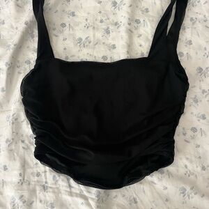 This sleek black camisole features a ruched design that adds a touch of elegance to its fitted silhouette. The sleeveless style makes it perfect for layering or wearing on its own during warmer days. Crafted from a soft, stretchy fabric, it offers both comfort and style.