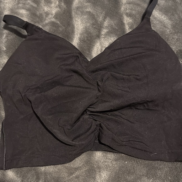 Stylish black bralette with a ruched front design. Perfect for layering or wearing alone.