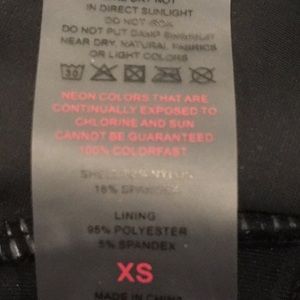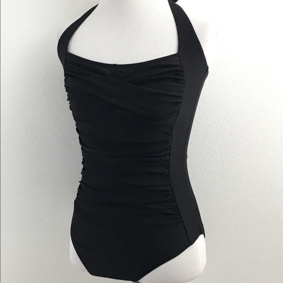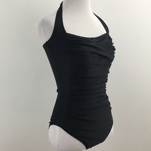 One piece black swimsuit has a ruched front panel & ties back of neck. Content of shell is 82% Nylon & 18% Spandex. Lining is 95% Polyester & 5% Spandex. Measurements flat are approximately 12” pit to pit & 21.5” long from center neckline to crotch seam. No brand tag. In excellent like new preowned condition with NO damage.