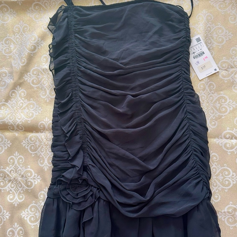 This chic black mini dress features a ruched design with ruffled details, perfect for a cocktail party or a night out. The sleeveless sheath silhouette is complemented by delicate spaghetti straps, offering a sophisticated and flattering fit.