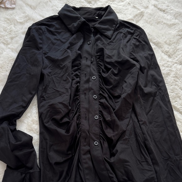 Stylish black long-sleeve top with ruching along the button-front placket. Lightweight, polished fabric for versatile wear. Collar detail adds smart structure for day-to-night outfits.