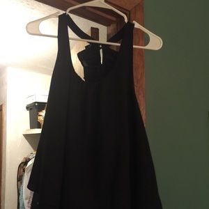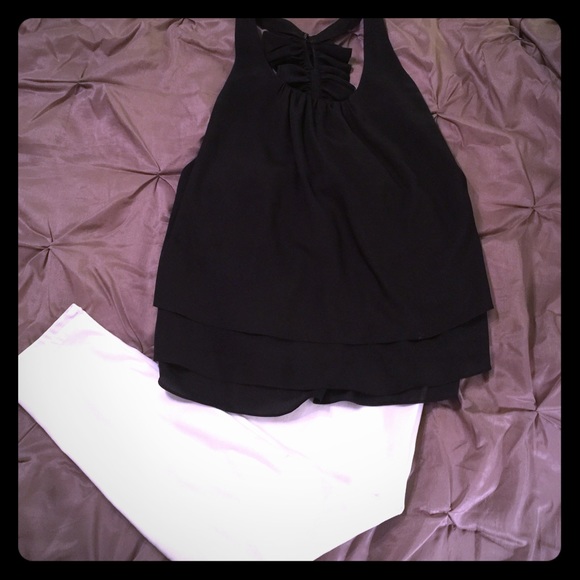 Black, ruffle back, double layered tank. It has elastic around the back and buttons at the neck.