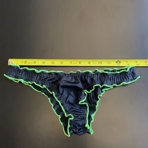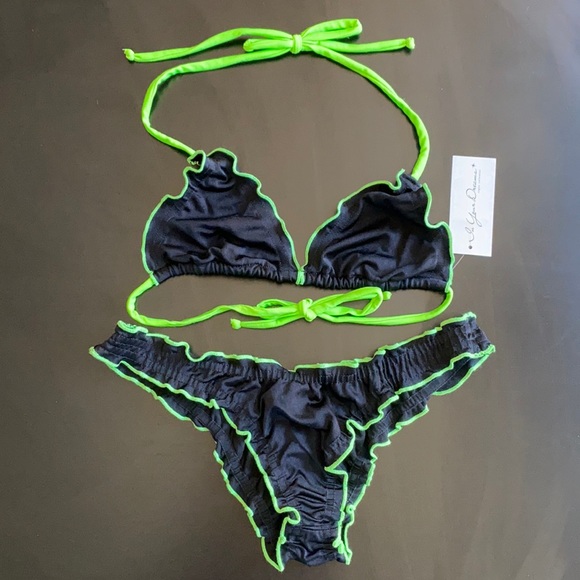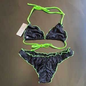Sexy black ruffle bikini with neon green trim- 100% made in the USA!