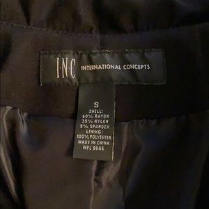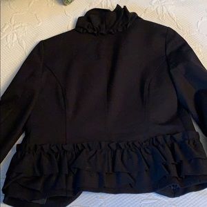 Macy’s black ruffle blazer! Outside fabric is rayon/nylon/spandex. Fully lined & warm for winter! Only worn a few times-in like new condition!