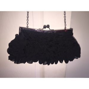 Black crossbody purse with ruffle design on front. Has a long silver chain strap. Used once for prom. Good for prom, weddings, or any "going-out" occasion.