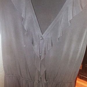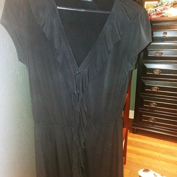 Black dress with ruffles down the front. Looks great with a belt and heels!!