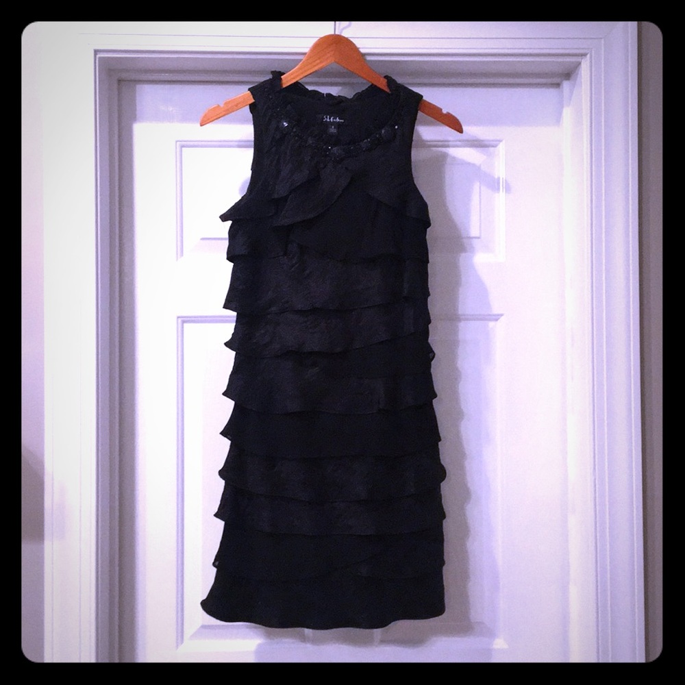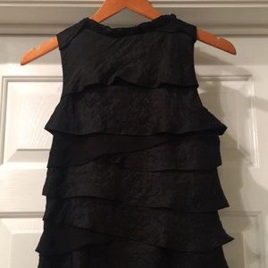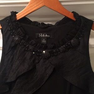Beautiful and classy “little black dress”! Asymmetrical ruffles are form flattering for any body shape and high beaded neckline adds a feminine touch!