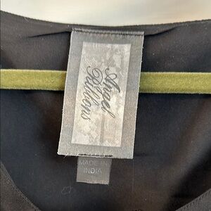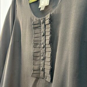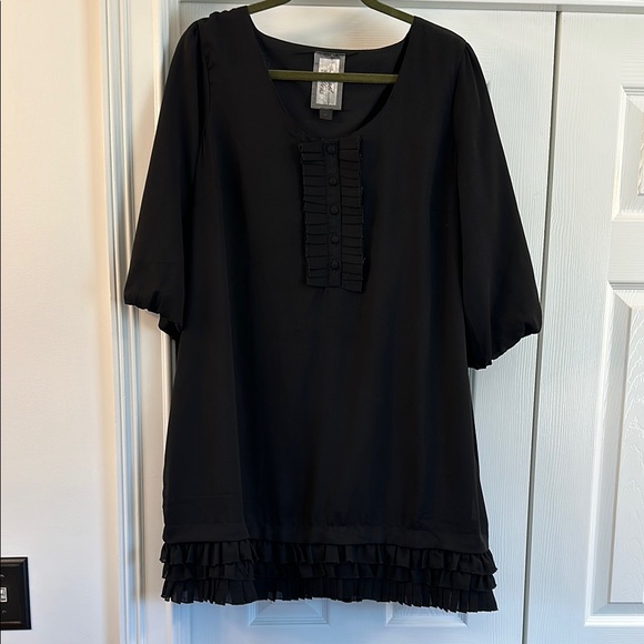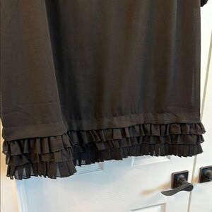 Black dress. Ruffle detail along bottom and down front. Was built in slip. Scoop neck.