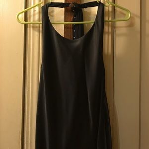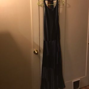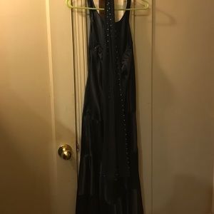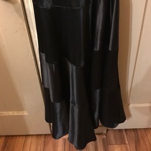 Beautiful black polyester (faux satin) gown with halter neck and tiered ruffles on the bottom. Halter tie is a beaded chiffon that drapes down the back. Size 6! Worn once!