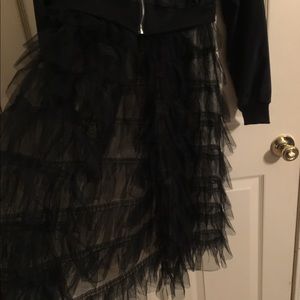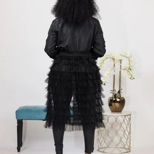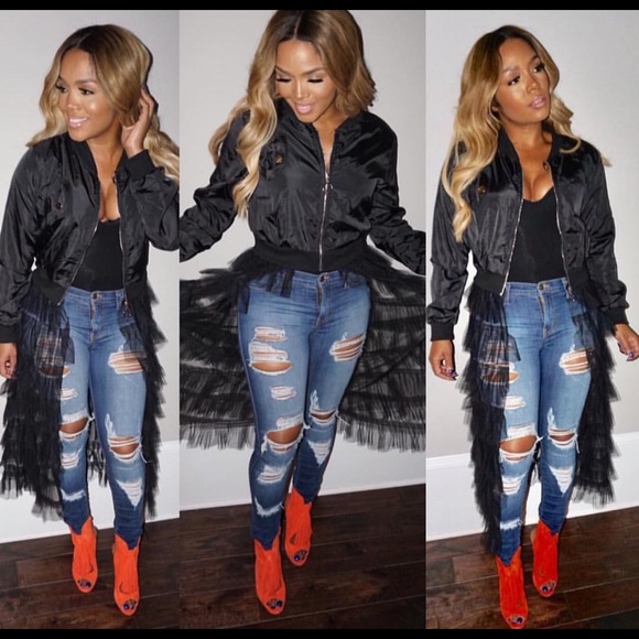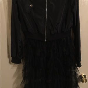 Black Bomber Jacket with attached Tulle Hem Ruffle detail at the bottom, zipper front closure!