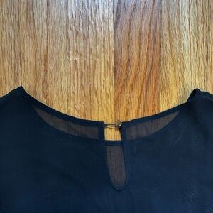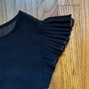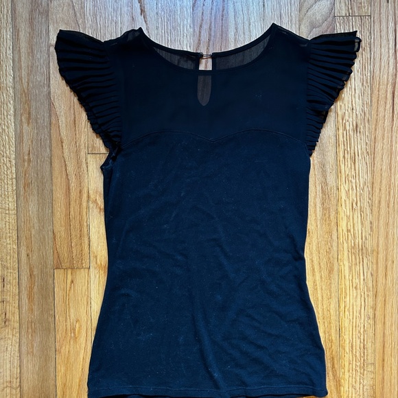 Black ruffle sleeve top. Fitted bodice, sheer panel at top/shoulders. Key hole closure at back neck. Short sleeve. Size S.