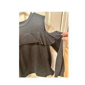Like new! Nice quality. Solid black sweatshirt. Crewneck. Cold shoulder. Cute ruffle detail across front and both sleeves. Shorter length, but not exactly cropped. Polly & Ester brand, bought from rue21. Junior sizing.