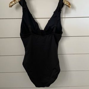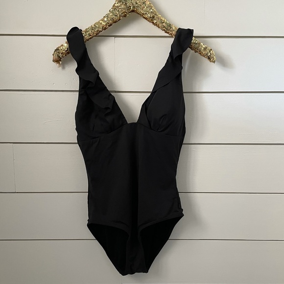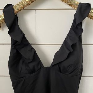 Like new! Very gently used black one piece with plunging neckline and ruffle details!