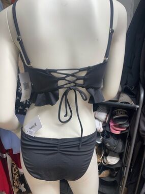 NWT Black Hurley 2 -piece bikini with tie-front top and ruffle hem. Slim adjustable straps. Lace up back Classic low-rise bikini bottoms. Simple and versatile swim set.