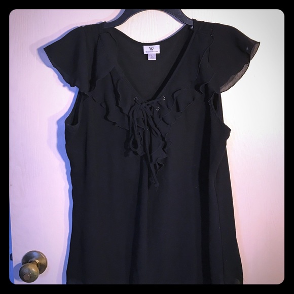 Silky black top with Ruffle and tie at front. Super-cute and form-fitting. Flowy cap sleeves. Like New!