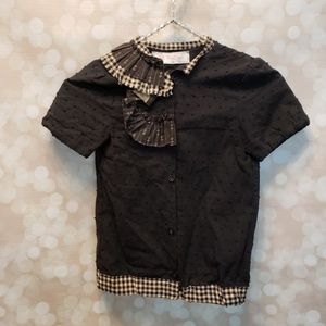 Great black shirt with plaid ruffles and plaid trim. Button down for ease of putting on!
