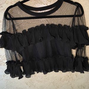 Black sheer and lined ruffle top. It’s shorter but not cropped. Sheer part has a tiny dot pattern. Super cute and perfect condition. Wore once. Liner is stretchy. Polyester wash in cold water.