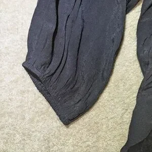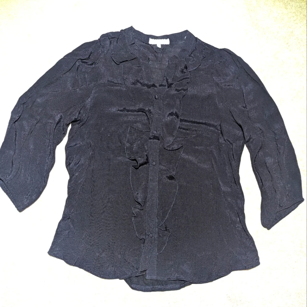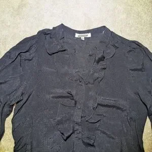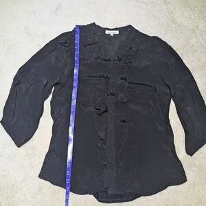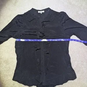 Black button up shirt with pretty little ruffle on neckline. Very good condition. Measurements in photos.