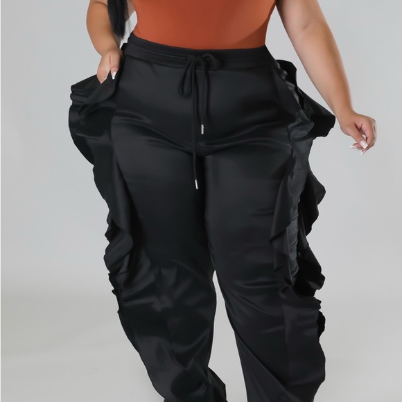 Stylish black track pants featuring elegant ruffle details. Perfect for a chic and comfortable look.