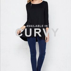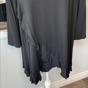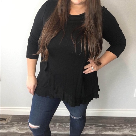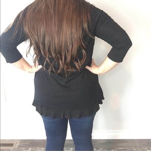 This classic black top has 3/4 length sleeves with a fun ruffle detail going across the front and bottom.
