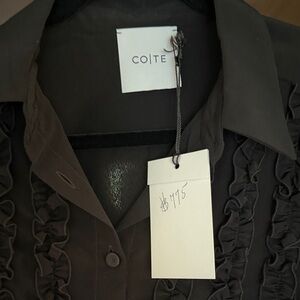 Black Ruffle-Front Button-Up Blouse