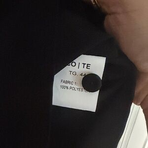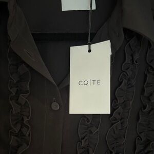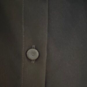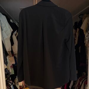 black long-sleeve blouse with decorative ruffle panels on the front. Lightweight, button-up design for easy layering. Polished collar and tailored silhouette for work or evening wear.
