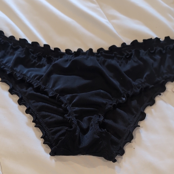 Stylish black bikini bottom with ruffled edges. Perfect for a chic beach look.