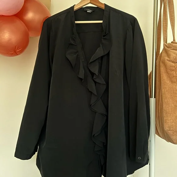 Elegant black blouse with ruffled front. Perfect for any occasion.