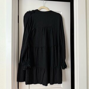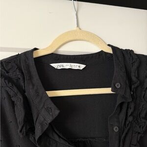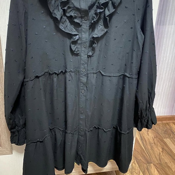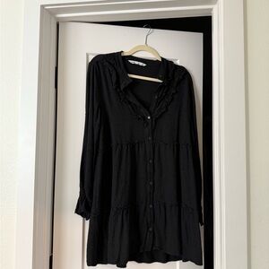 Elegant black dress with ruffled details and button-up front. Perfect for any occasion.